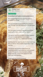 This glowing review reflects our commitment to flawless service, refined presentation, and unforgettable flavours. Every event we cater is treated as a Signature Catering Ltd experience; personal, polished, and perfectly tailored to you.